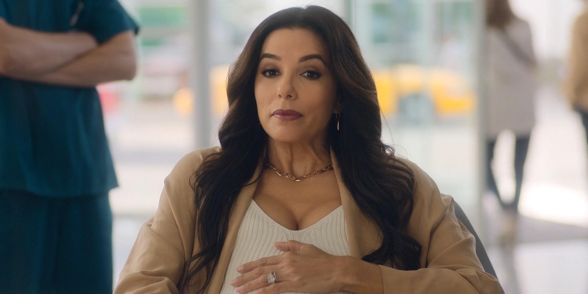 Eva Longoria is sexy in the show “Land of Women (Tierra de mujeres)” season 1 episode 4 which was released in 2024. The actress demonstrates us a good cleavage here.