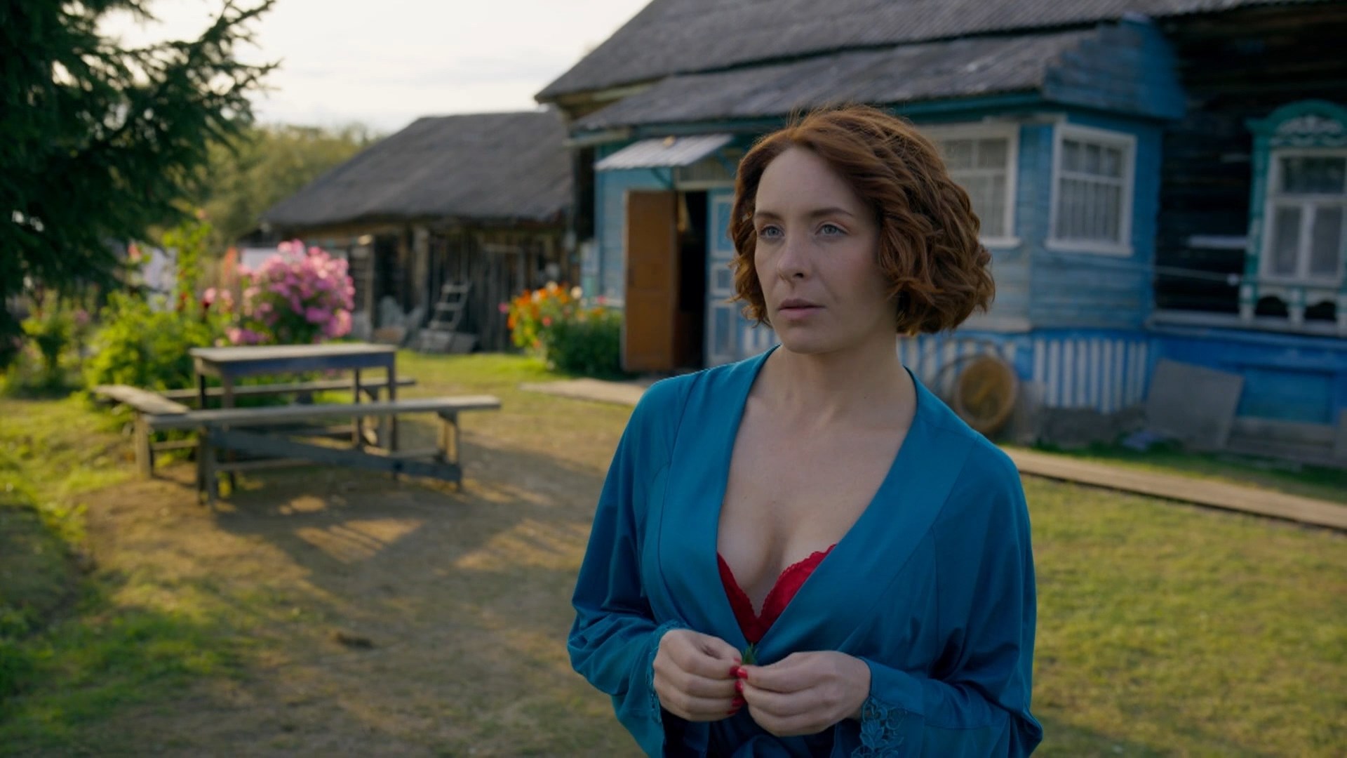 Olga Kavalay-Aksyonova is sexy in the show “Kak Derevyanko Lomonosova igral” season 1 episodes 2-3 which were released in 2024. She shows us a good cleavage in the clip.