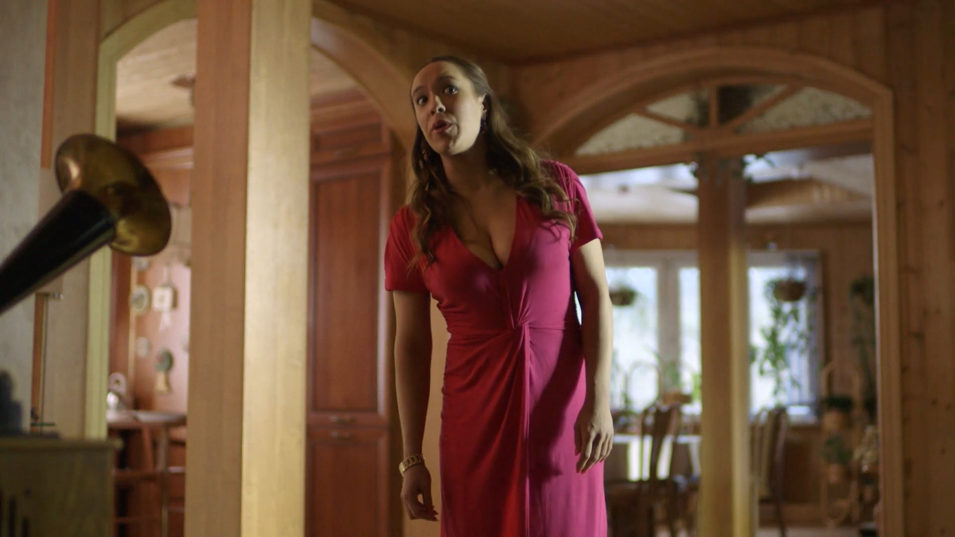 Ravshana Kurkova is very sexy in the show “A u nas vo dvore” season 1 episode 9 which was released in 2017. She shows us a good cleavage in this clip.