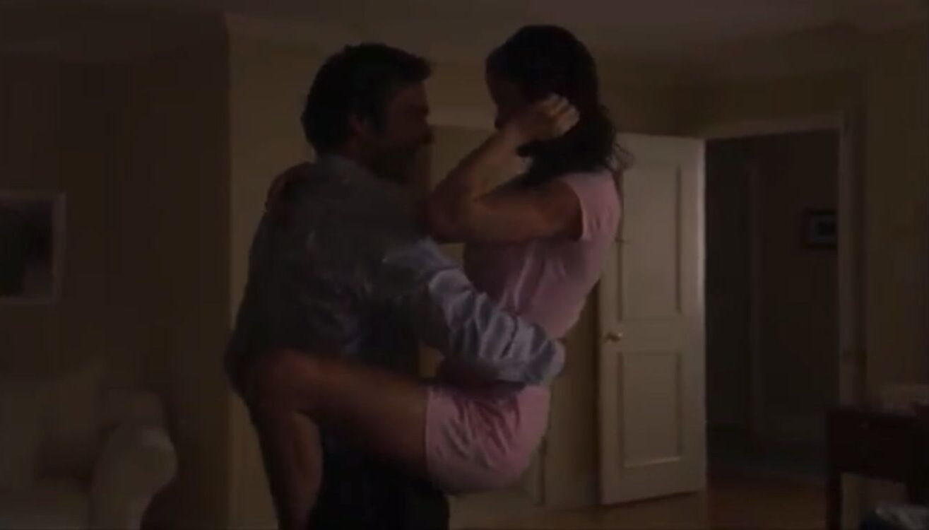 After Shannon Elizabeth close her window, she turn around and walk towards her husband and she starts pushing him towards the bed. She then climbs on top of him and start kissing him. Her husband then carried her and put on top of bed and sit on top of her. Shannon then open her pink shirt can she reveal her pink bra and panties, then they kissing each other as they’re having sex.
